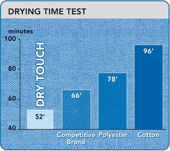 Kuruma testlerinde ise yine DRYTOUCH® kumaşların polyester ve pamuğa göre 2 kat daha hızlı kuruduğu gözlemlenmiştir.