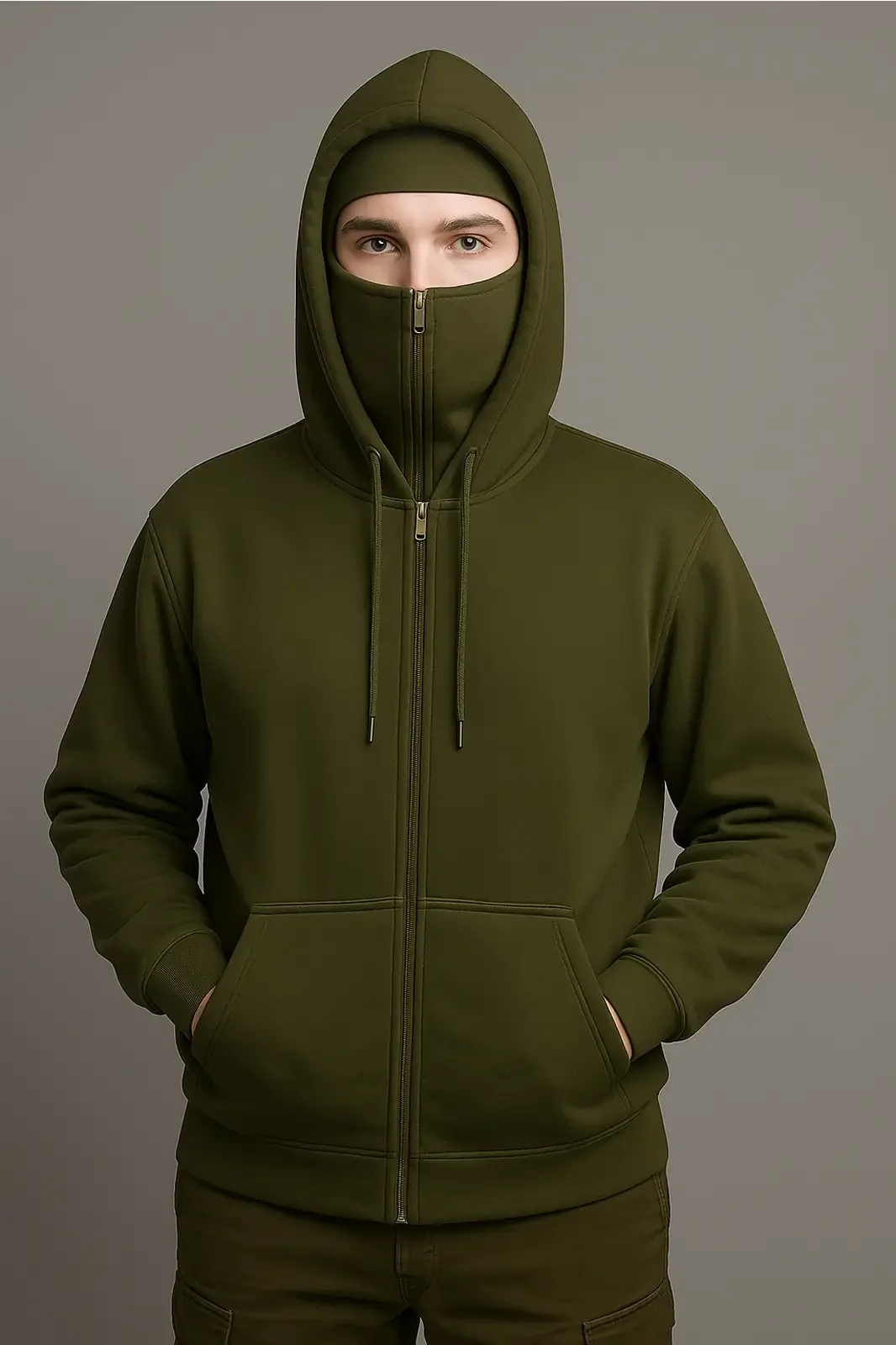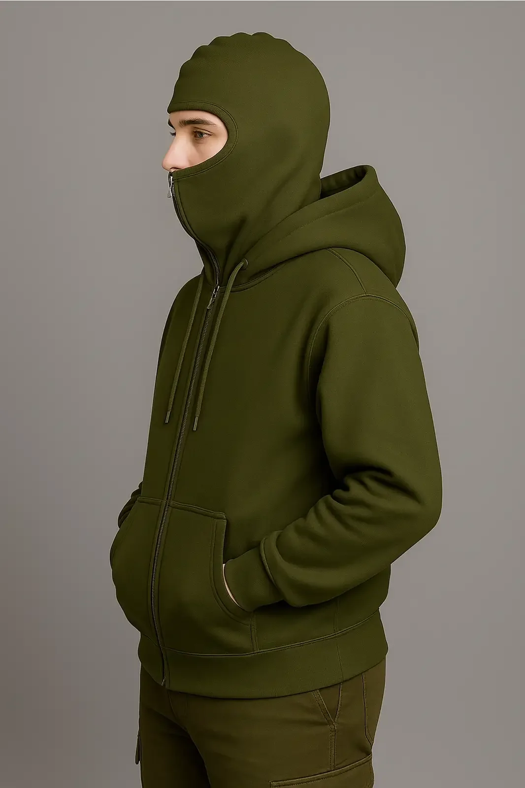 Haki yeşili rengi ve modern kar maskesi detayıyla öne çıkan Kar Maskeli Kışlık Fermuarlı Kapşonlu Haki Yeşili Sweatshirt, hem outdoor hem günlük kullanım için uygundur. XS–5XL beden seçenekleri ile herkes için idealdir.