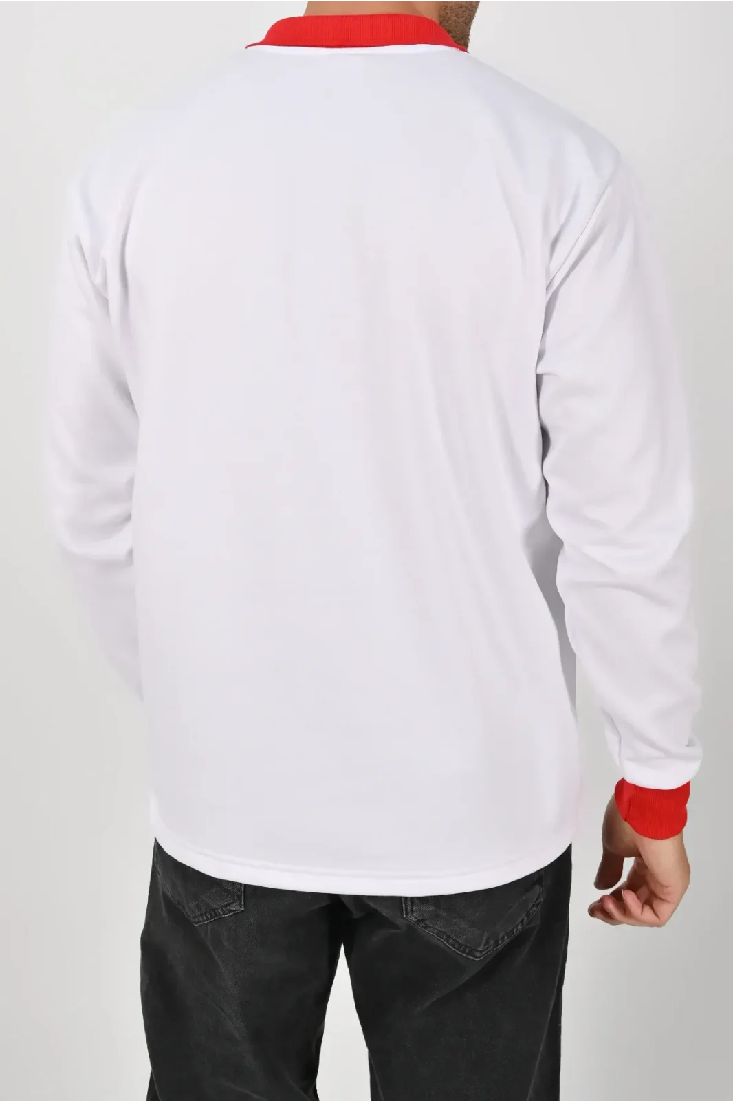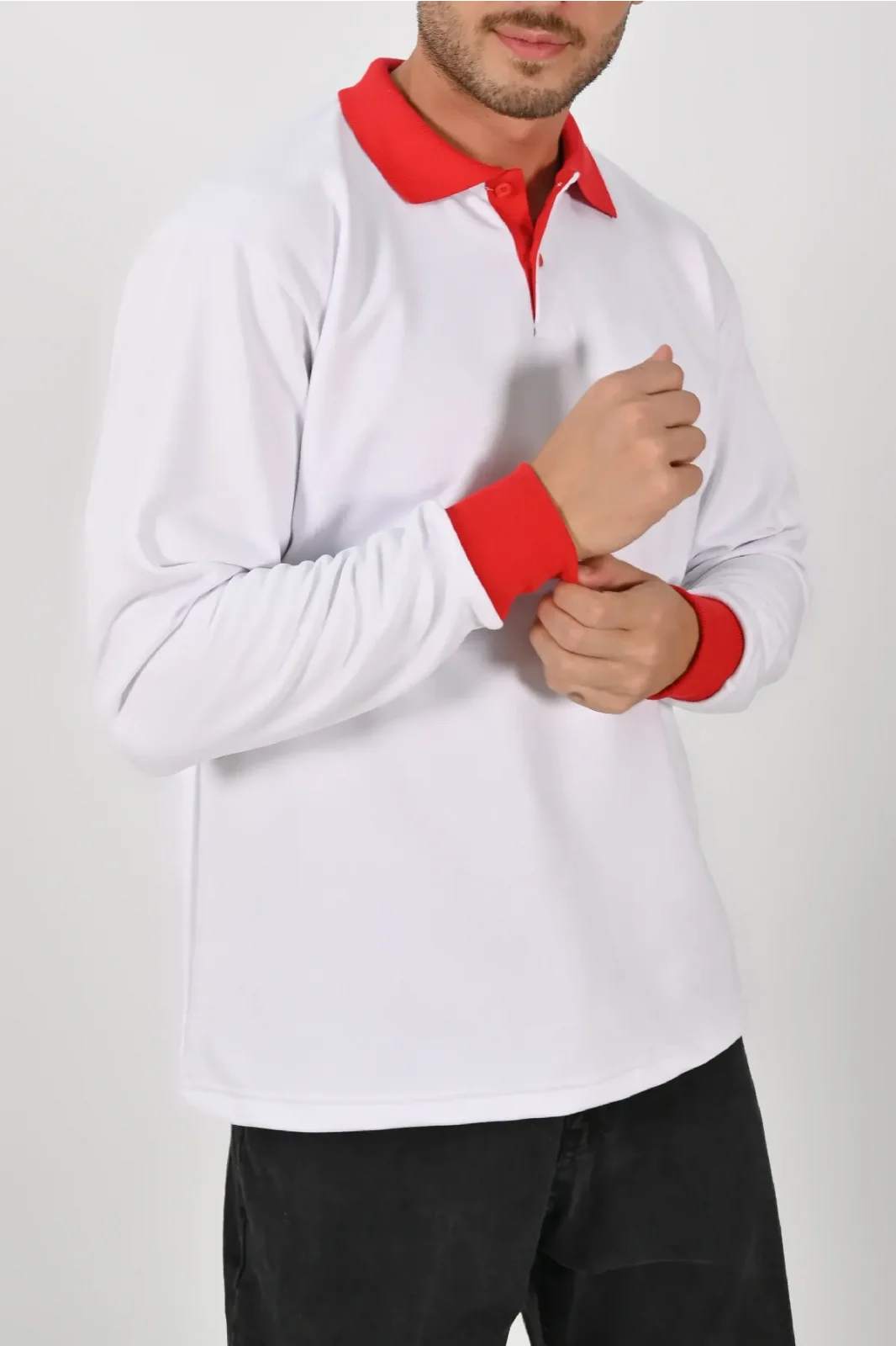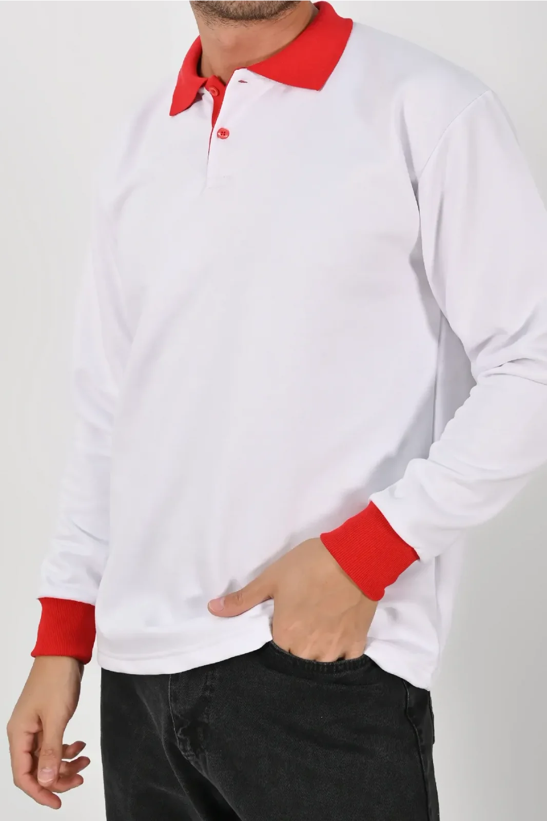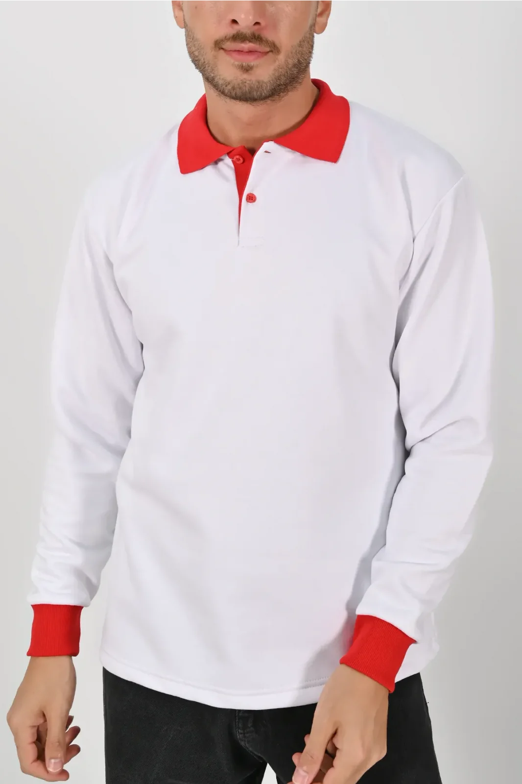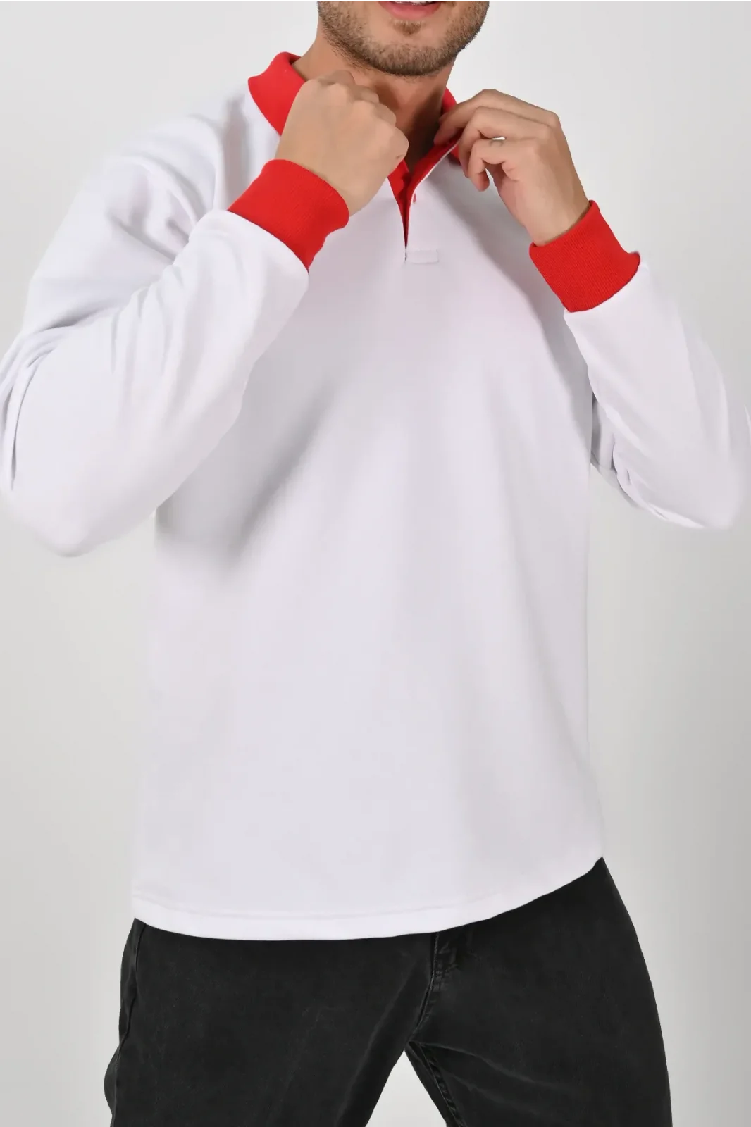 Beyaz ve kırmızı uyumu ile öne çıkan Kışlık Beyaz Çift Renkli Polo Yaka Sweatshirt Kırmızı Yakalı, hem zarif hem enerjik bir görünüm sunar. XS–5XL beden seçenekleri ile herkes için uygundur.