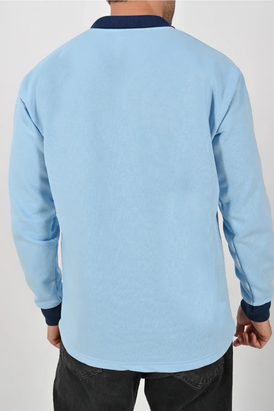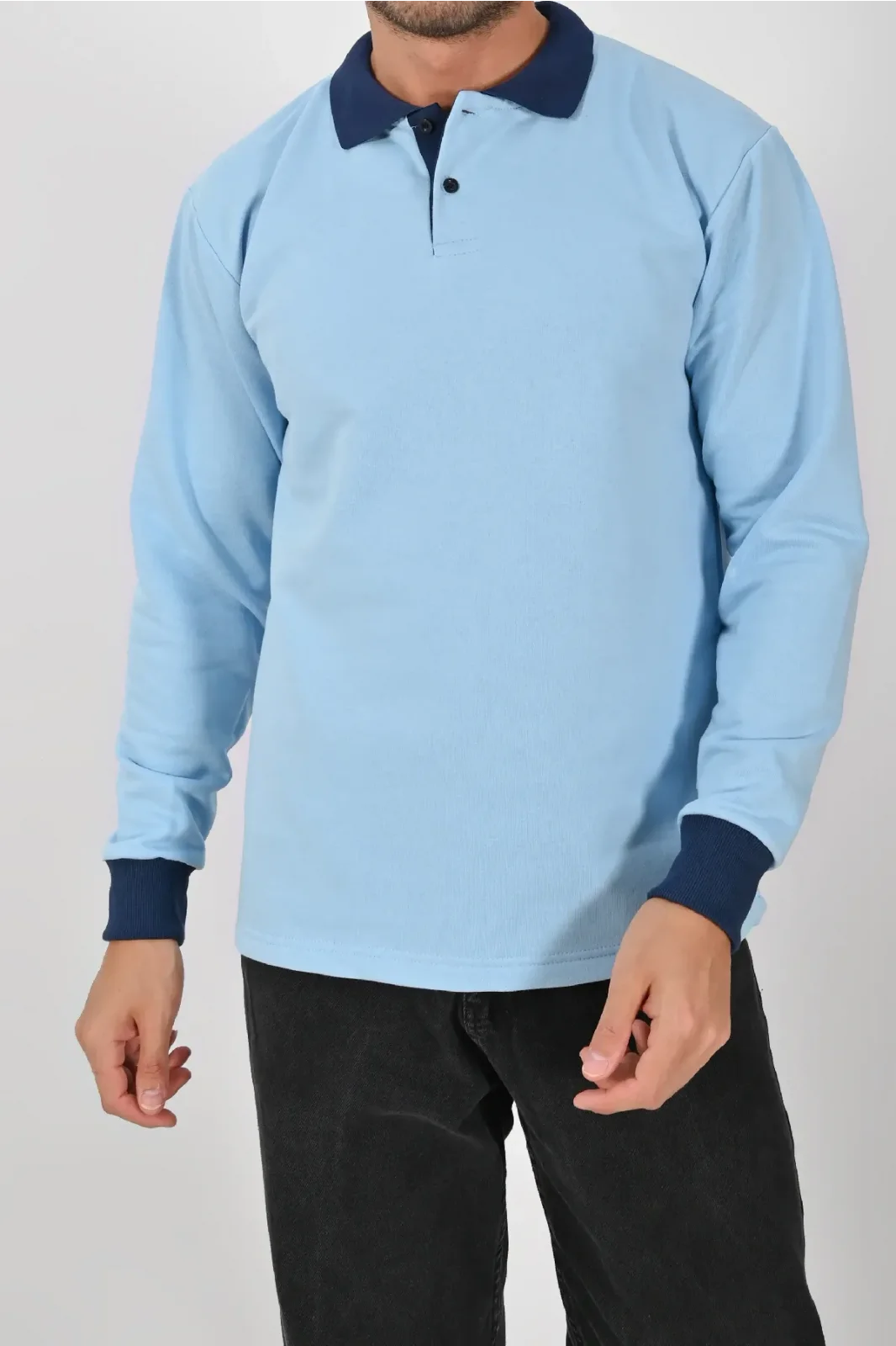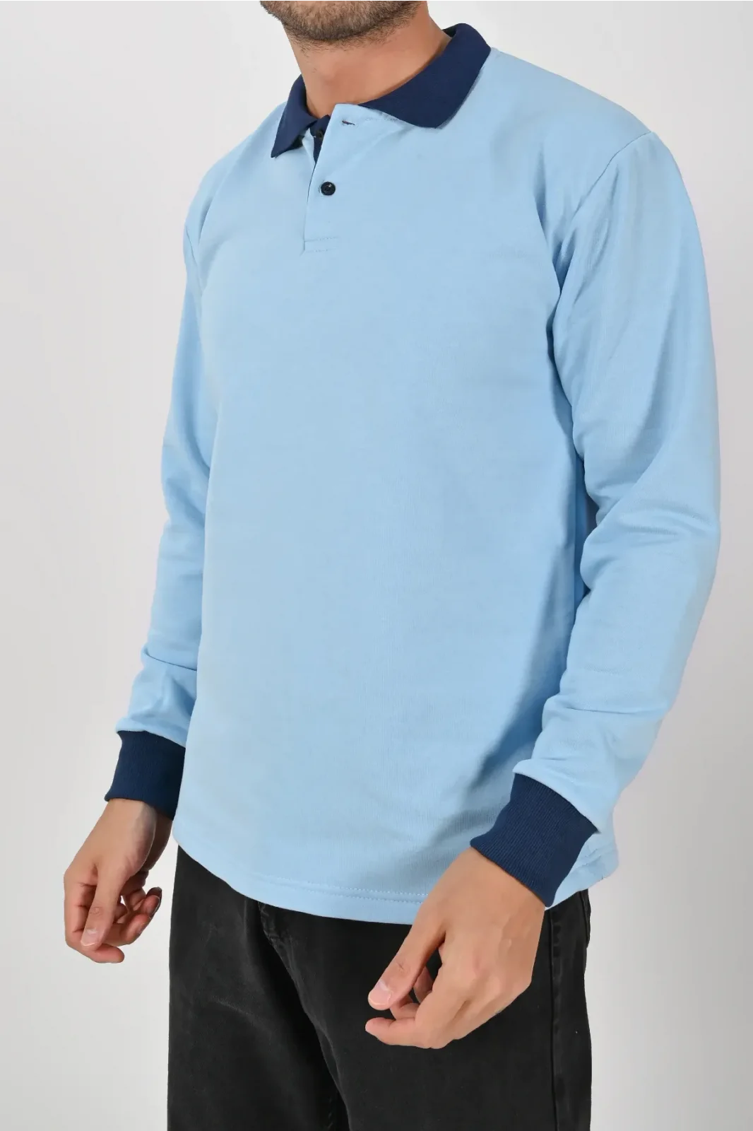 Buz mavisi ve lacivertin uyumuyla tasarlanan Kışlık Buz Mavisi Çift Renkli Polo Yaka Sweatshirt Lacivert Yakalı, hem şıklık hem konfor sunar. XS–5XL beden aralığı farklı kullanıcı tiplerine hitap eder.