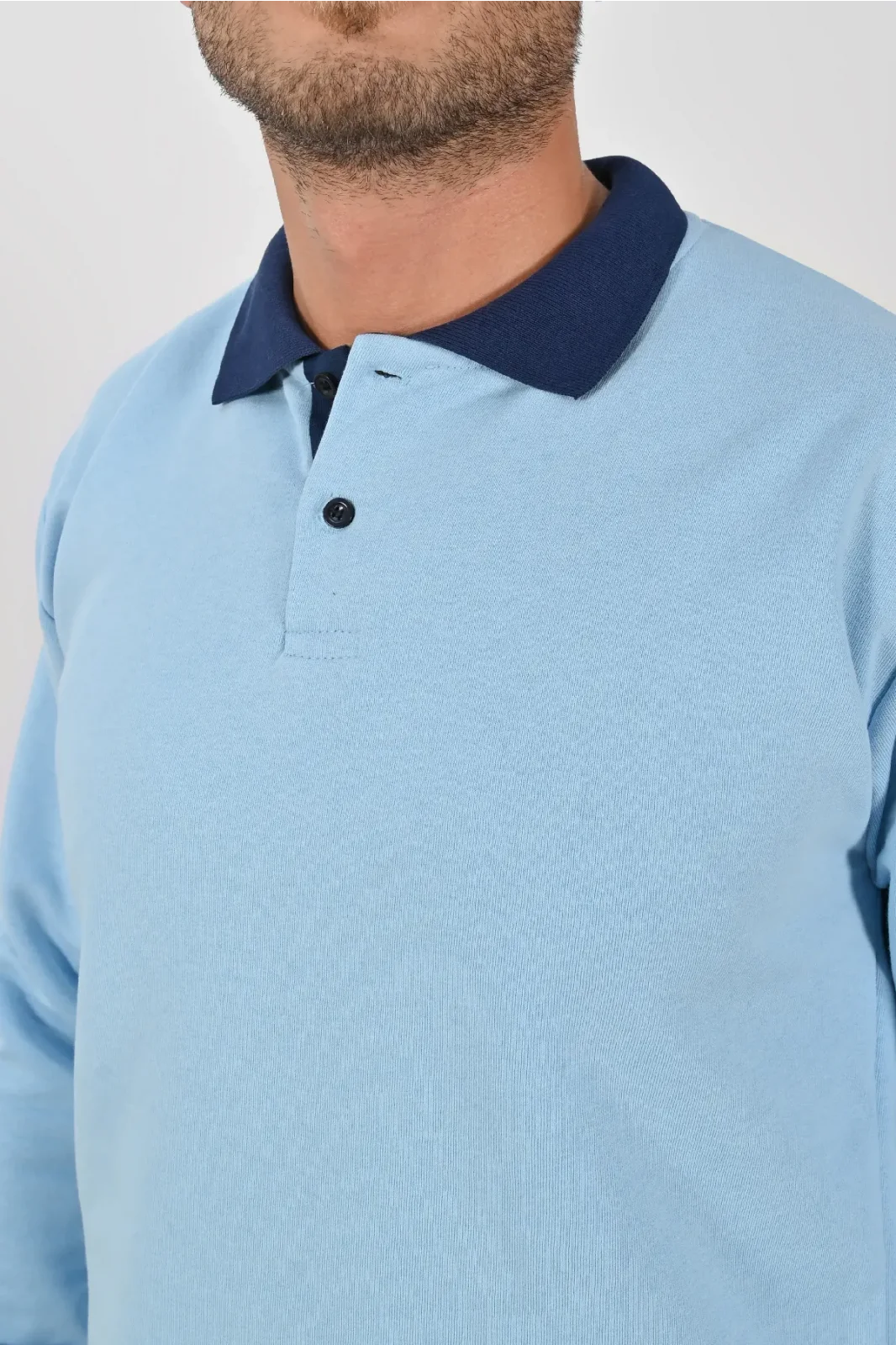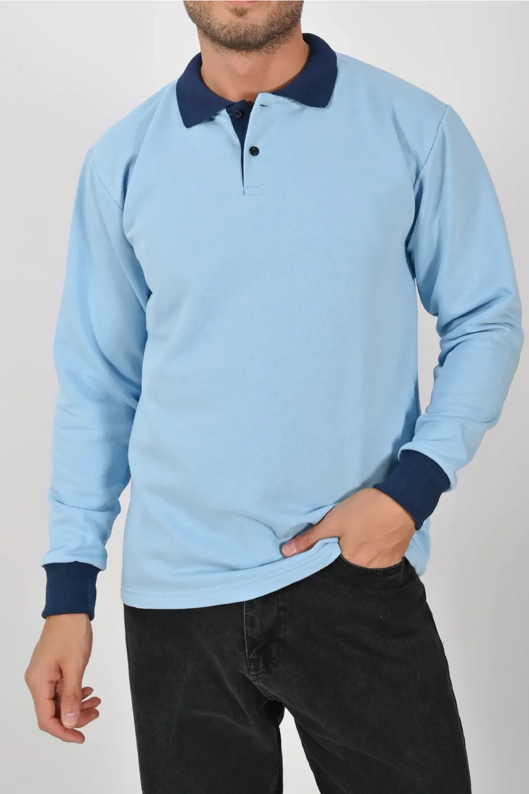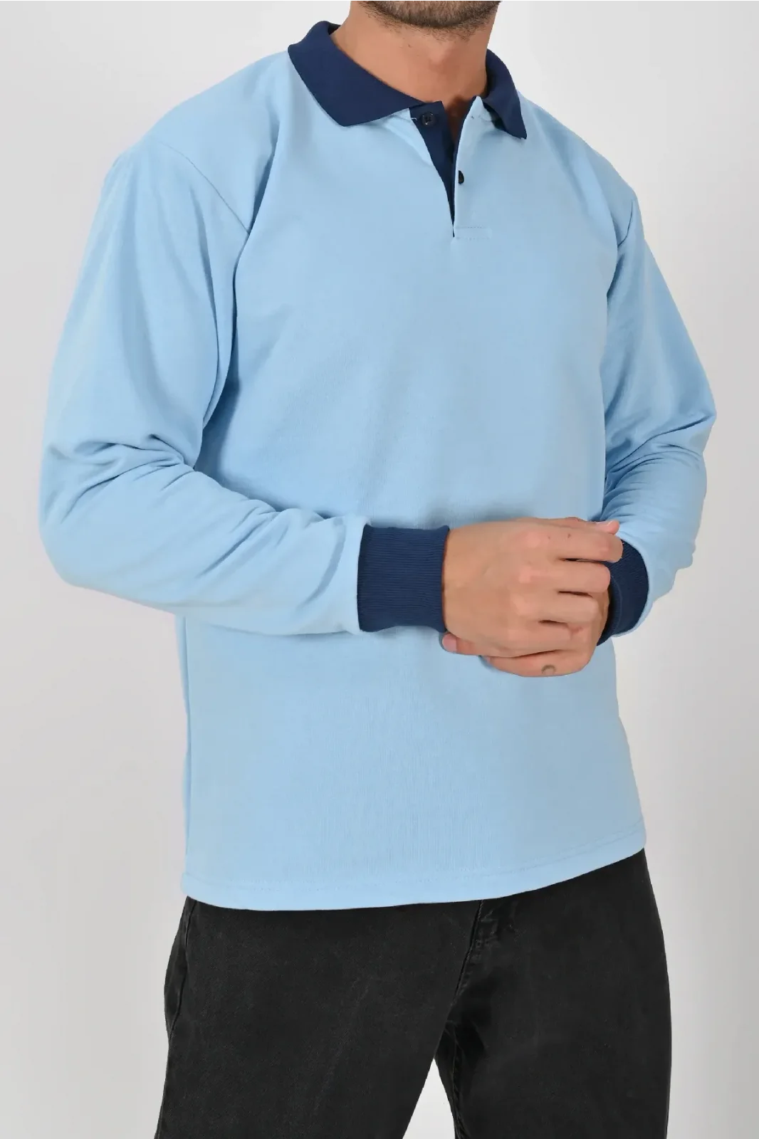 Buz mavisi ve lacivertin uyumuyla tasarlanan Kışlık Buz Mavisi Çift Renkli Polo Yaka Sweatshirt Lacivert Yakalı, hem şıklık hem konfor sunar. XS–5XL beden aralığı farklı kullanıcı tiplerine hitap eder.