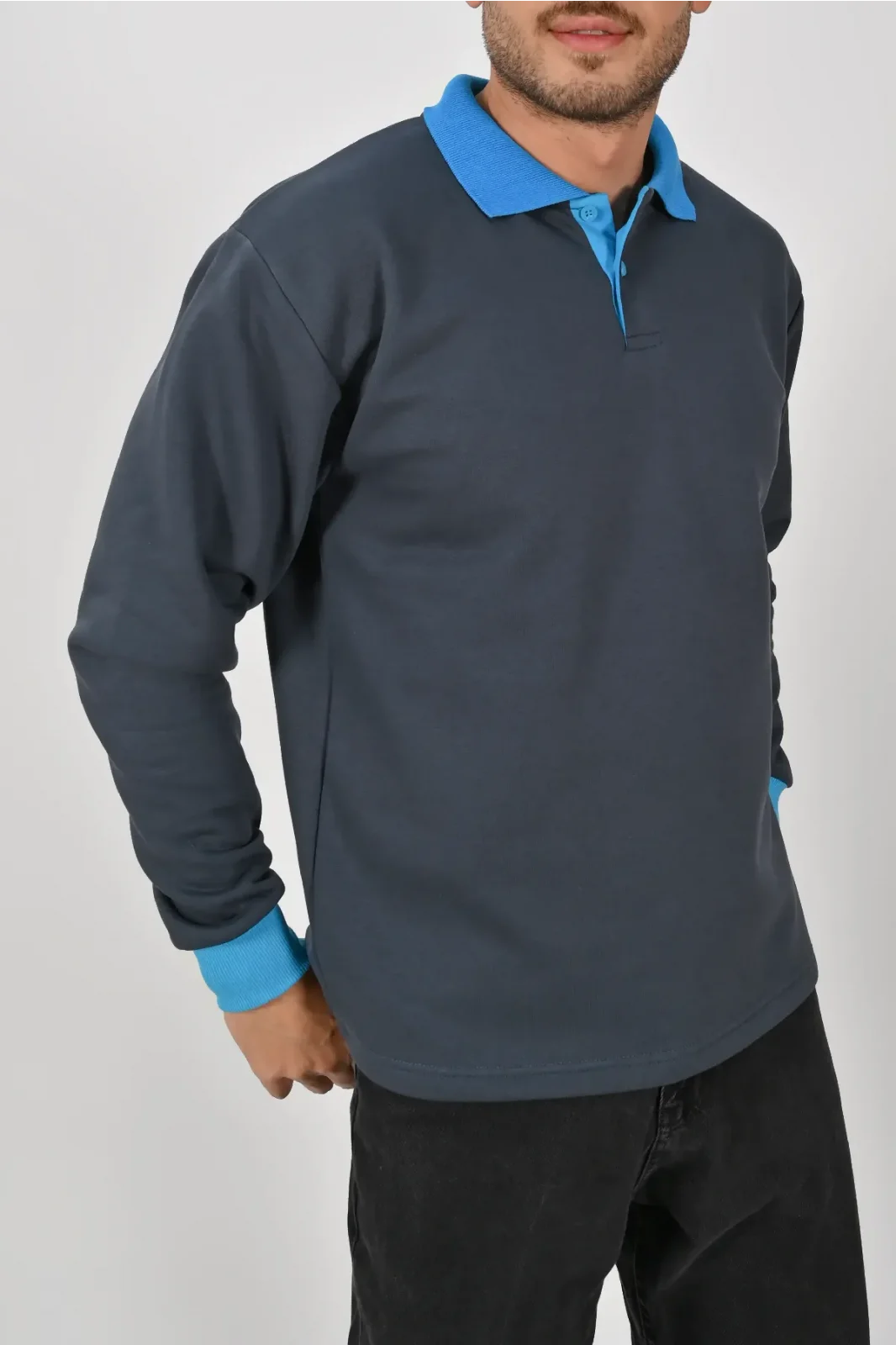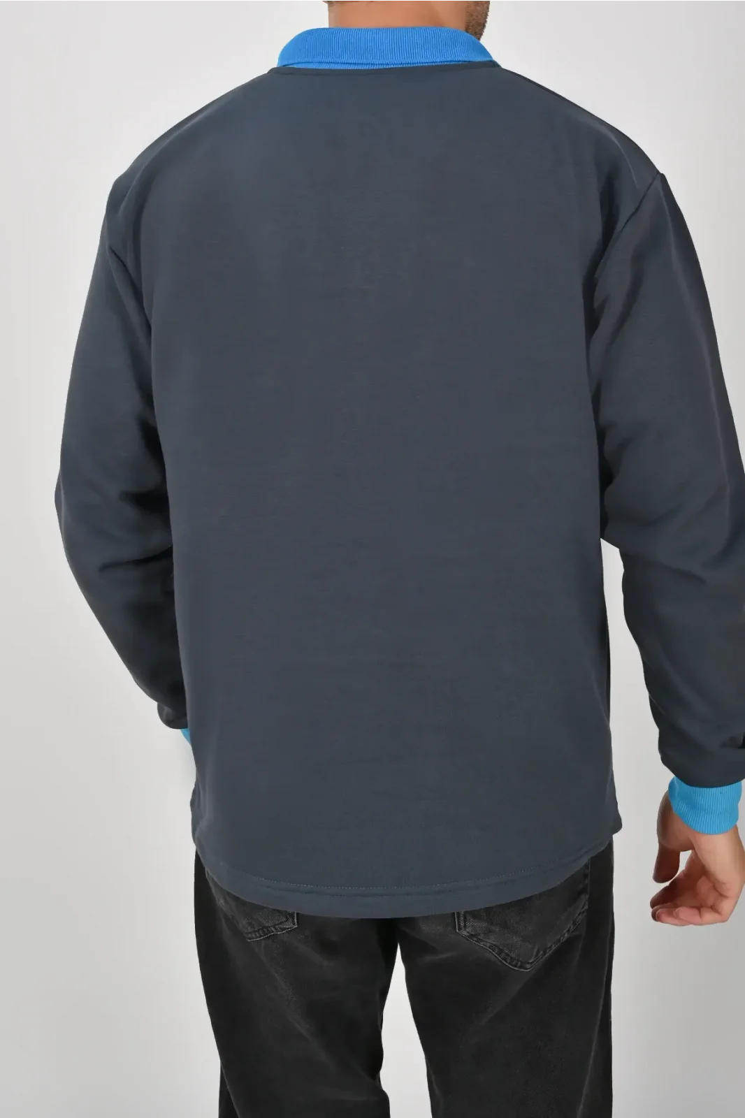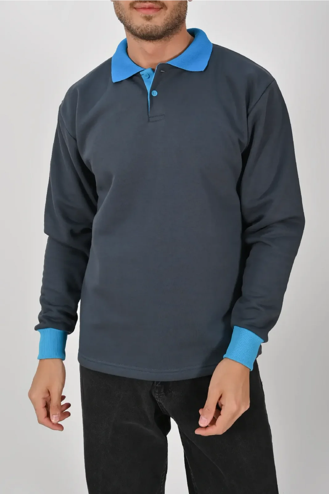 Füme ve mavi kontrastıyla dikkat çeken Kışlık Füme Çift Renkli Polo Yaka Sweatshirt Mavi Yakalı, şık ve modern bir görünüm sunar. XS–5XL beden seçenekleri farklı kullanıcı gruplarına uygundur. Birinci kalite kumaşı uzun süreli kullanım sağlar.