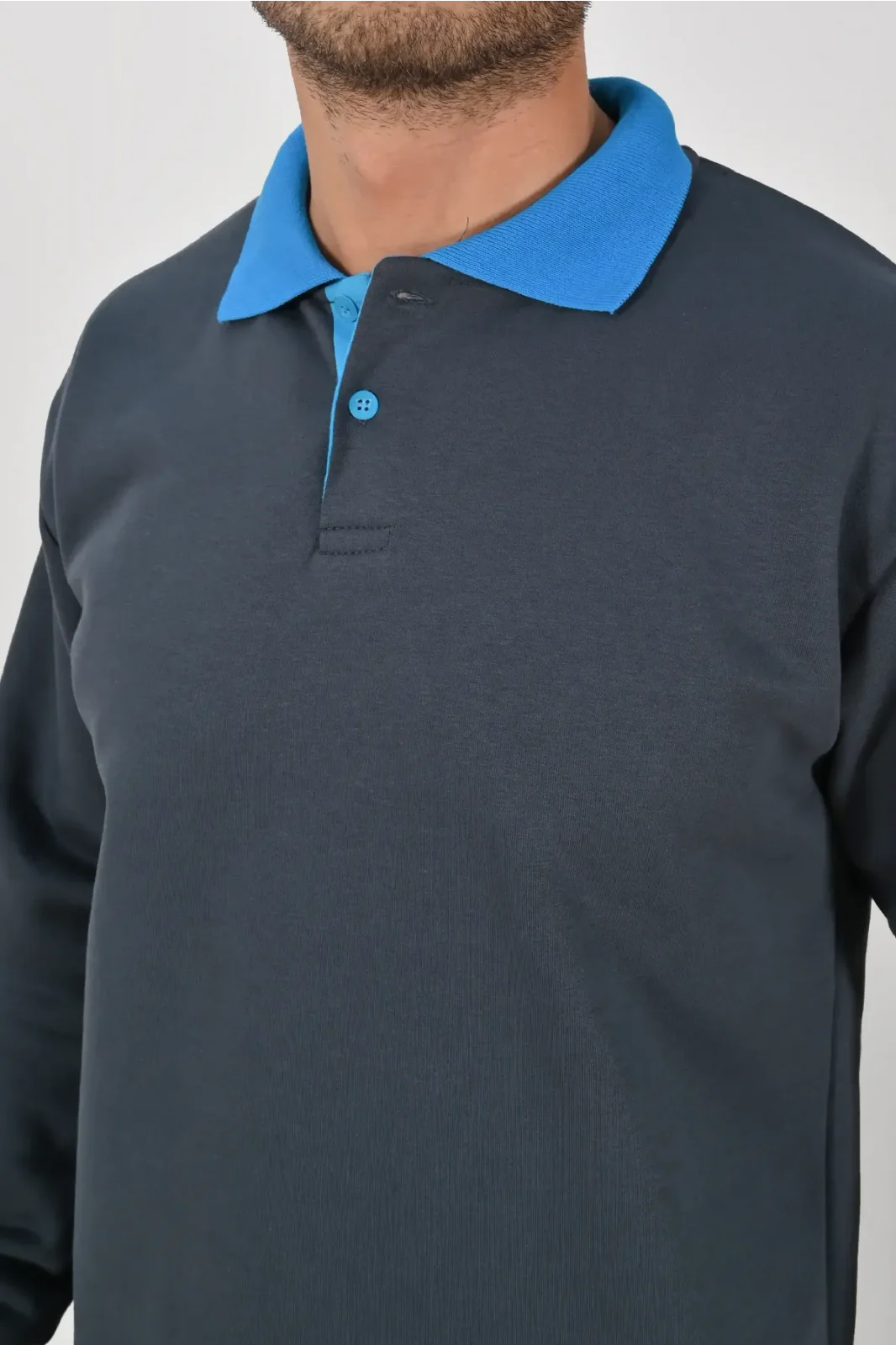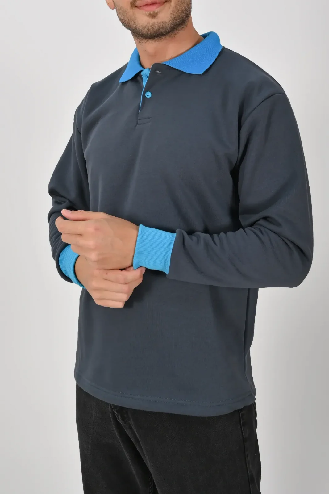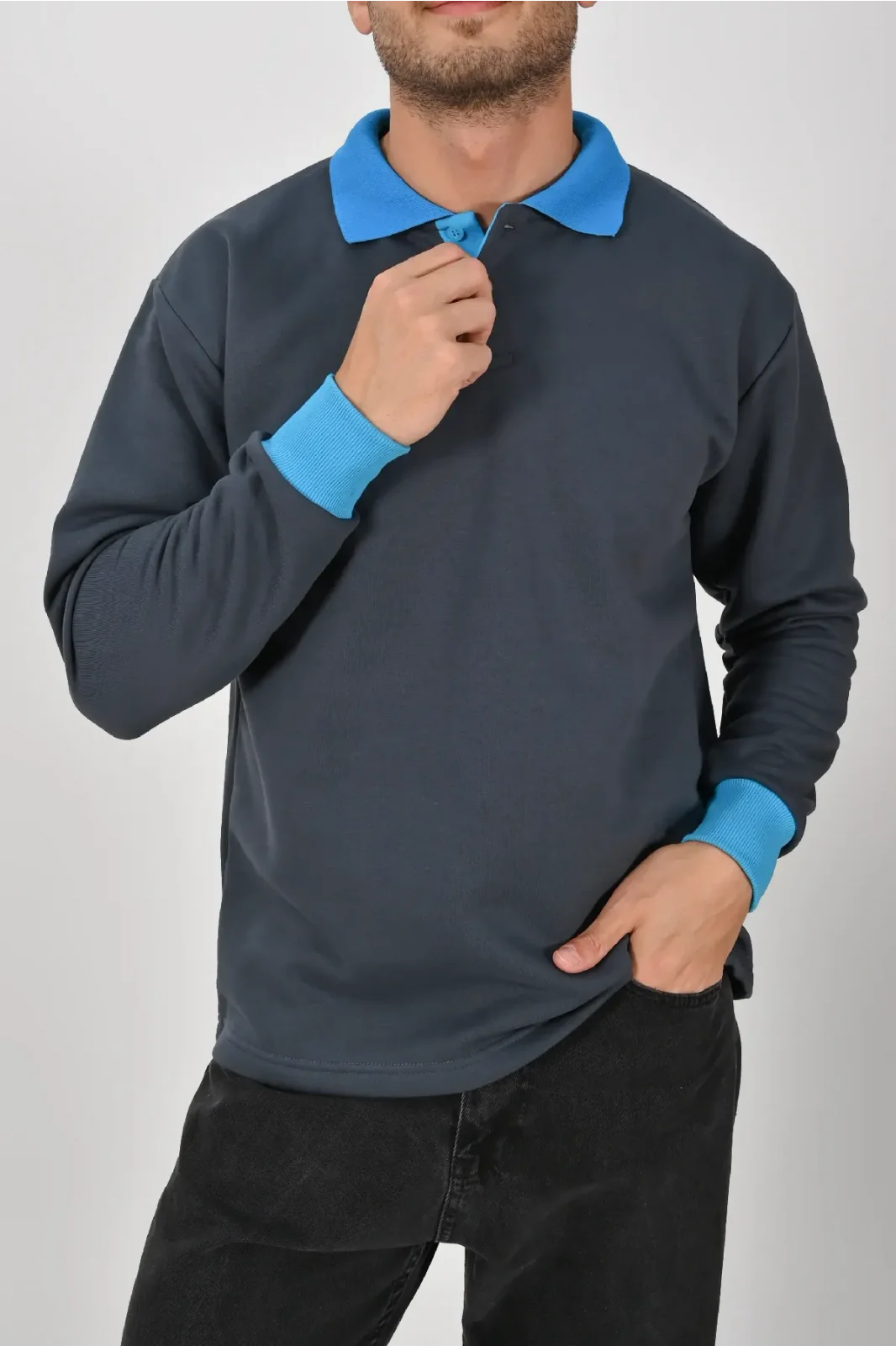 Füme ve mavi kontrastıyla dikkat çeken Kışlık Füme Çift Renkli Polo Yaka Sweatshirt Mavi Yakalı, şık ve modern bir görünüm sunar. XS–5XL beden seçenekleri farklı kullanıcı gruplarına uygundur. Birinci kalite kumaşı uzun süreli kullanım sağlar.