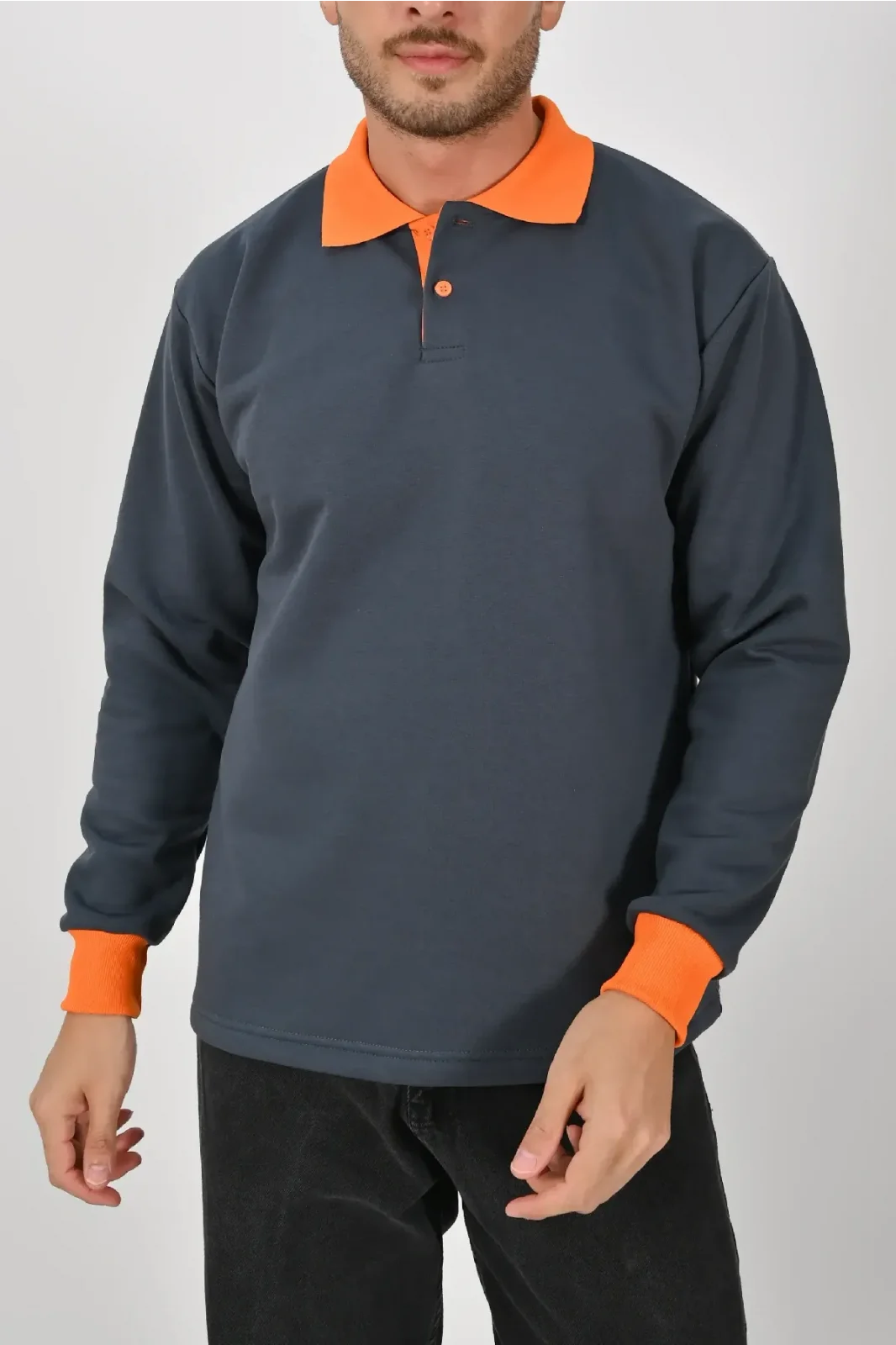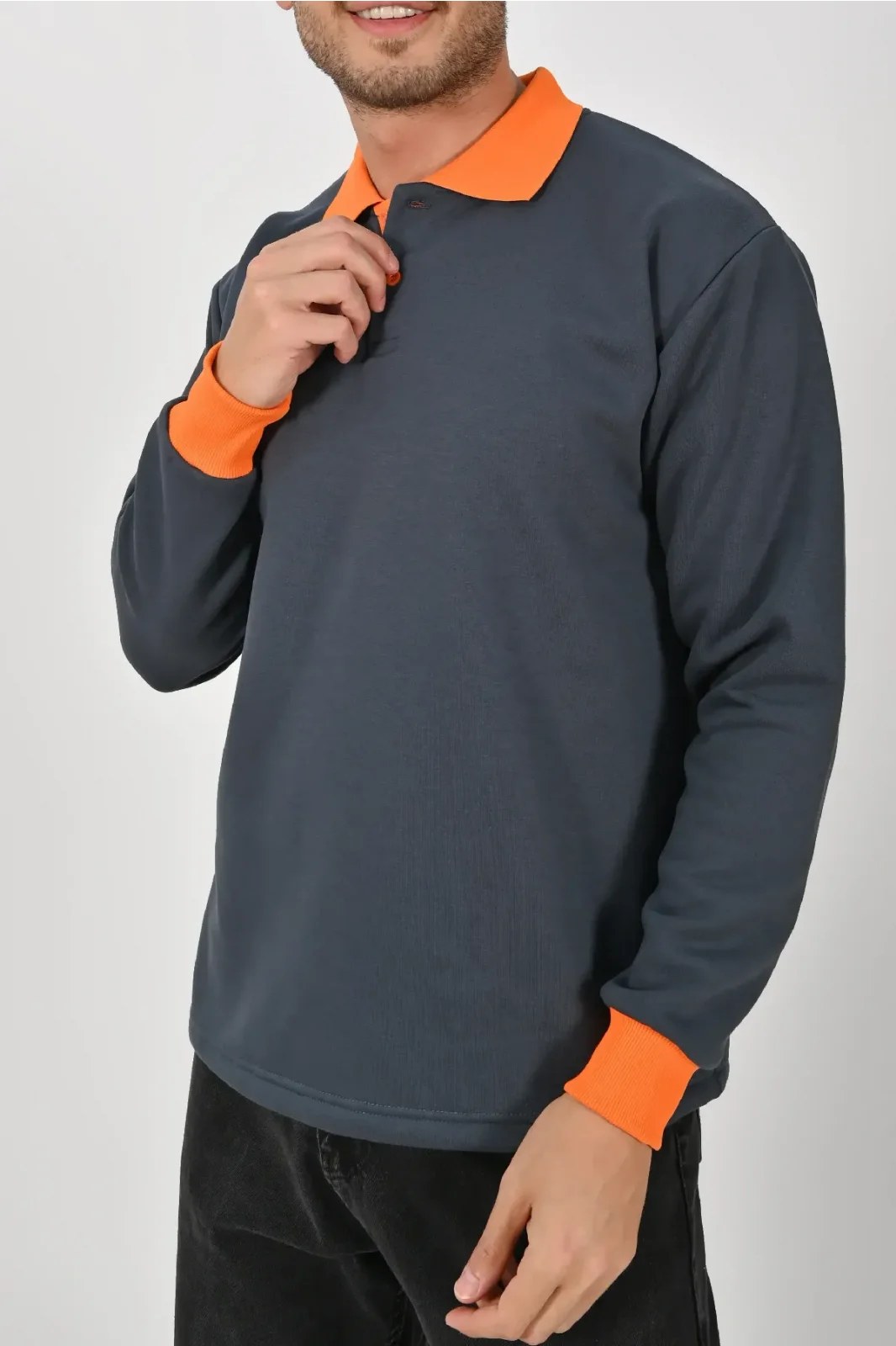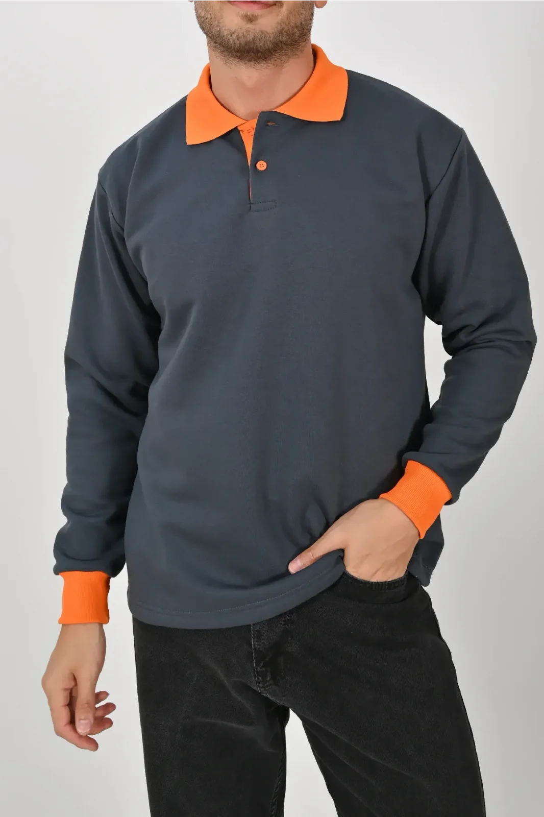 Füme ve turuncunun güçlü kontrastıyla öne çıkan Kışlık Füme Çift Renkli Polo Yaka Sweatshirt Turuncu Yakalı, iddialı bir stil tercih edenler için tasarlanmıştır. XS–5XL beden seçenekleri farklı kullanıcı tiplerine uygundur.