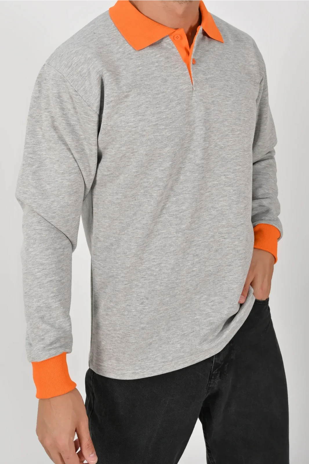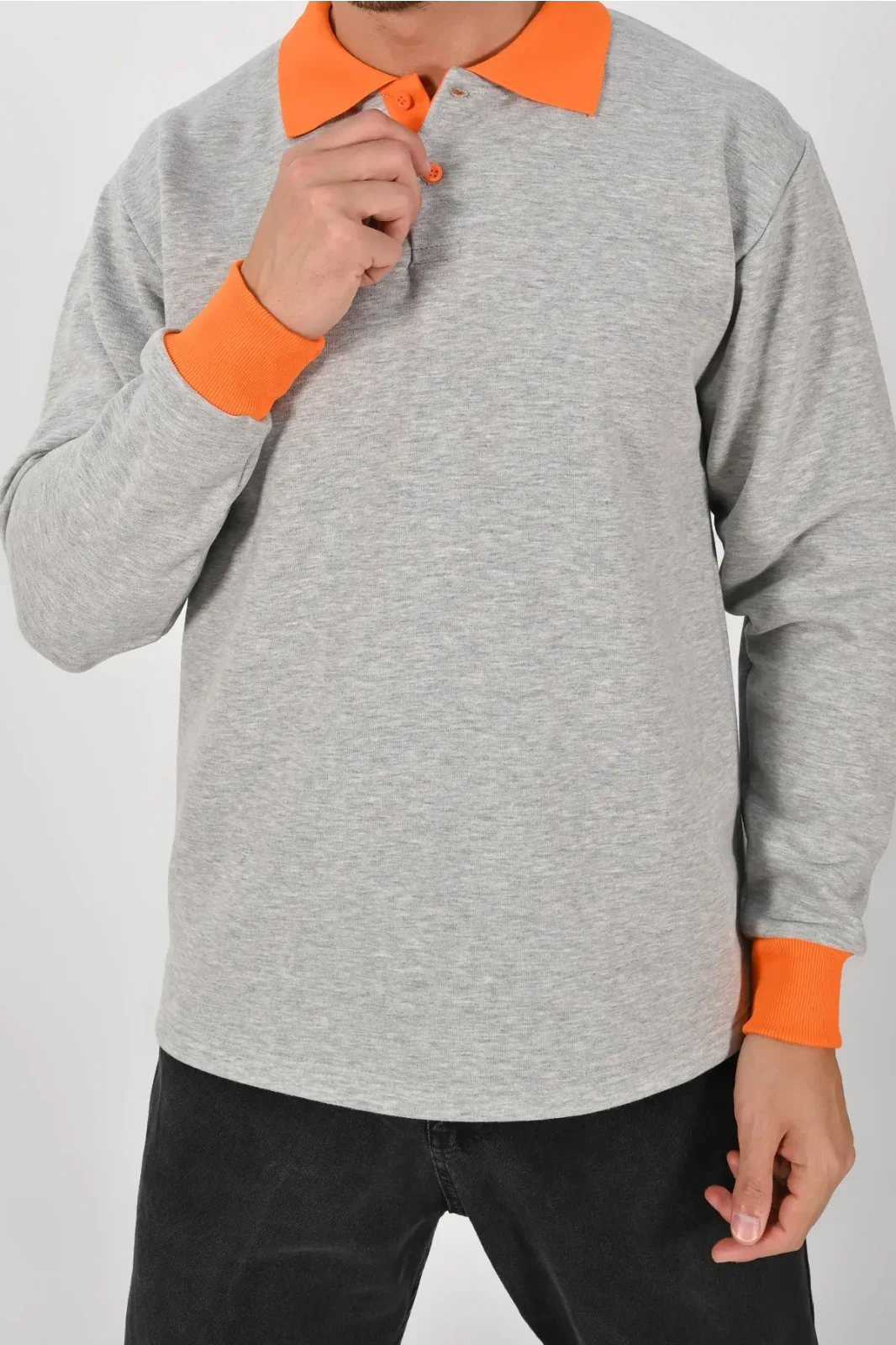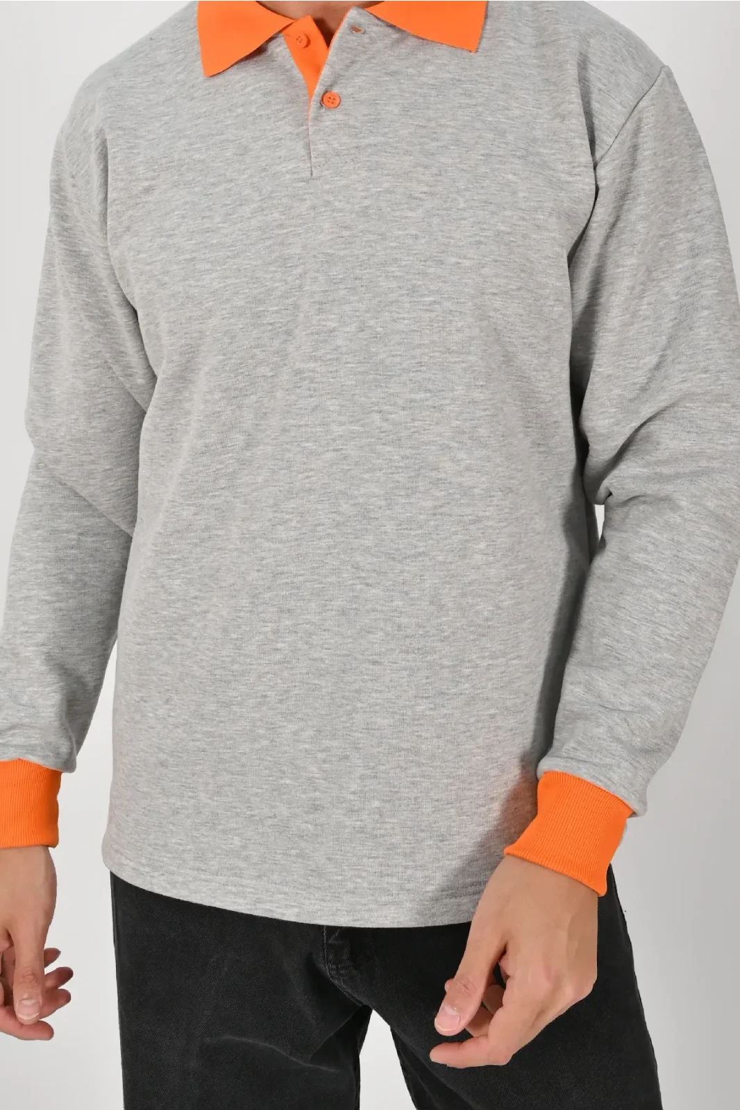 Gri ve turuncunun kontrastıyla tasarlanan Kışlık Gri Çift Renkli Polo Yaka Sweatshirt Turuncu Yakalı, canlı bir görünüm kazandırır. XS–5XL beden aralığı ile farklı vücut tiplerine uygundur.