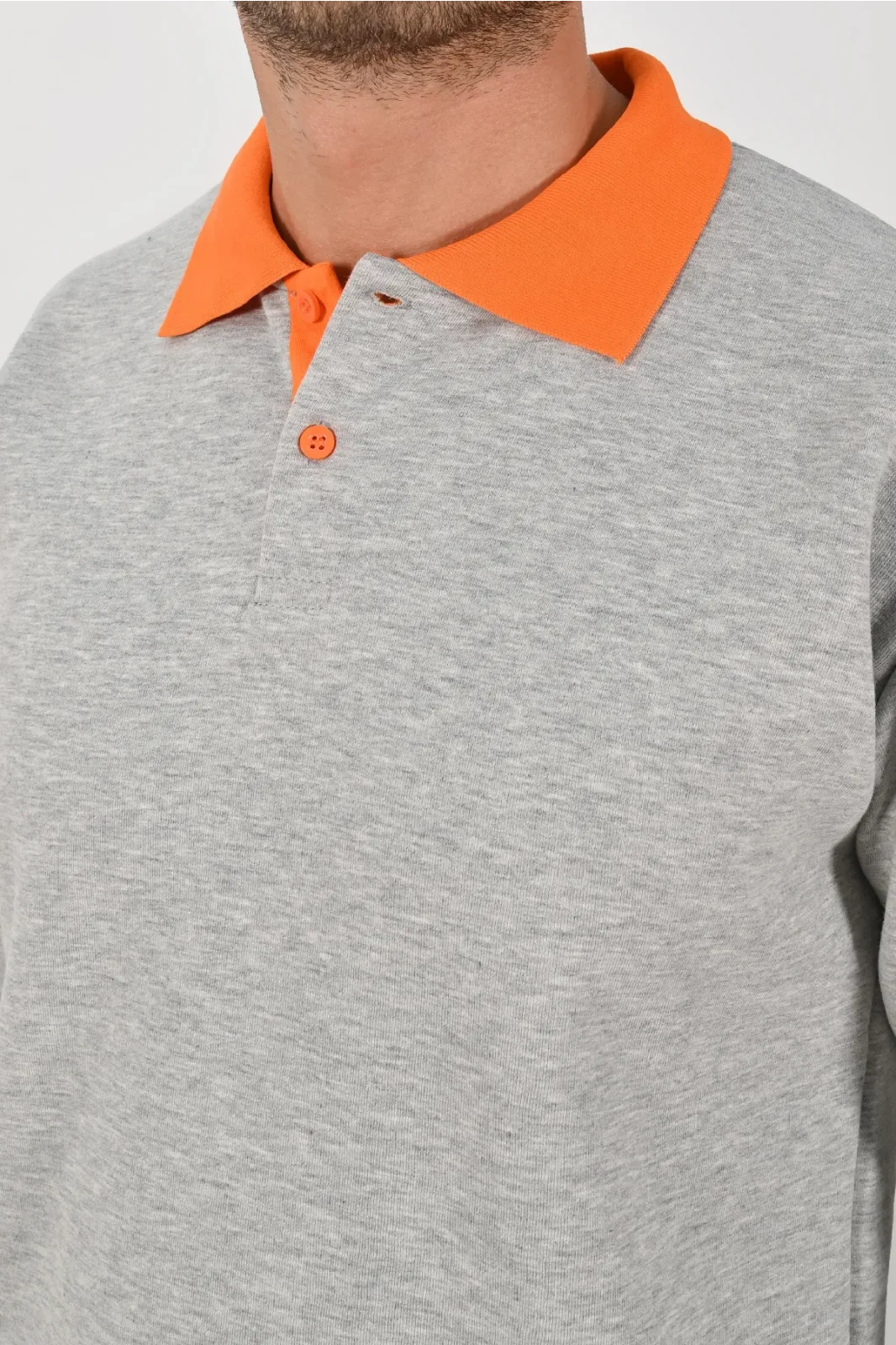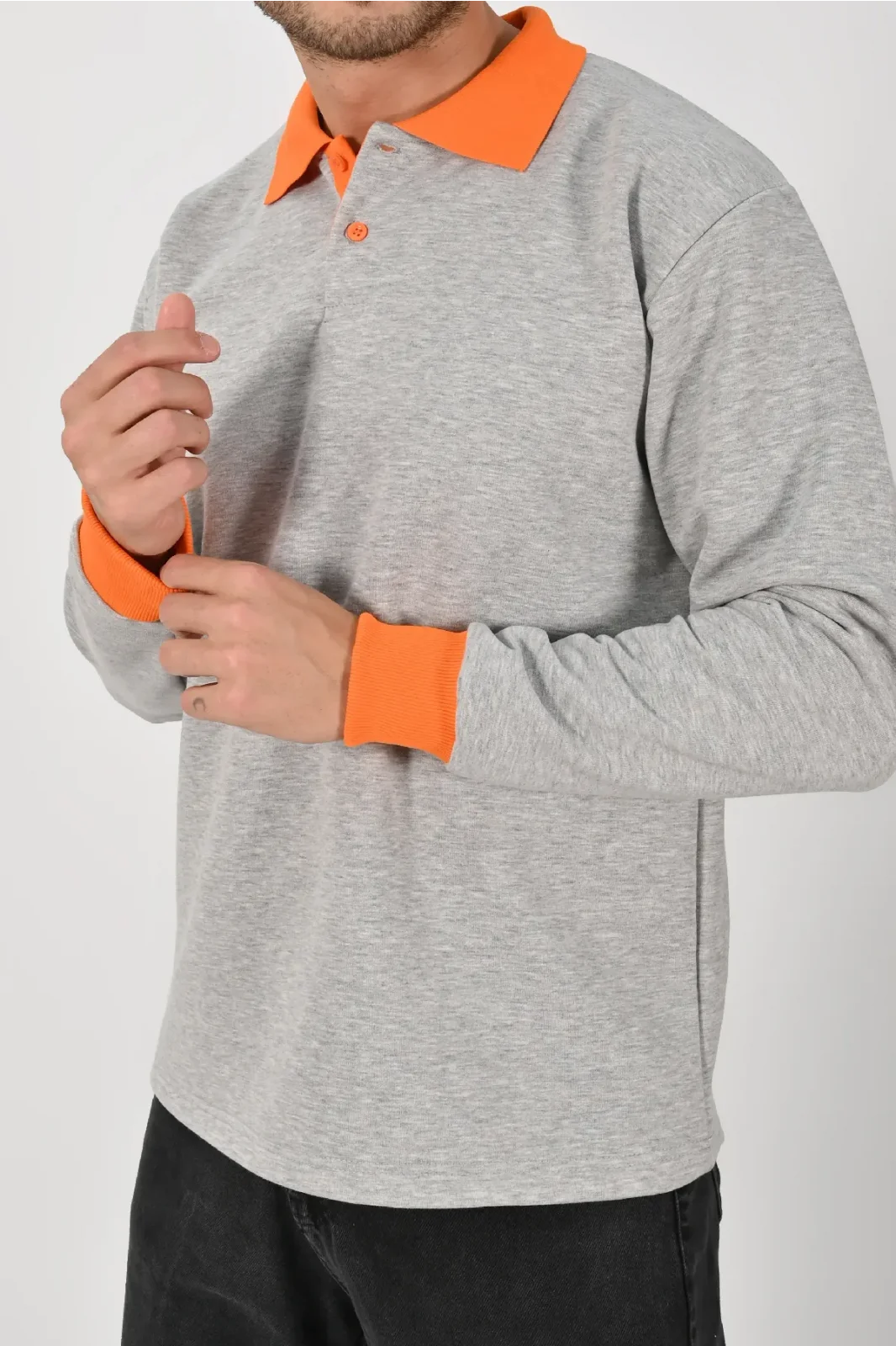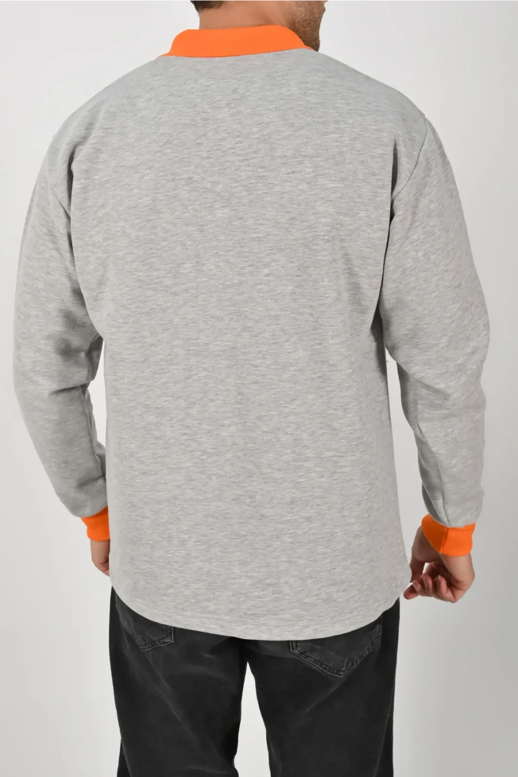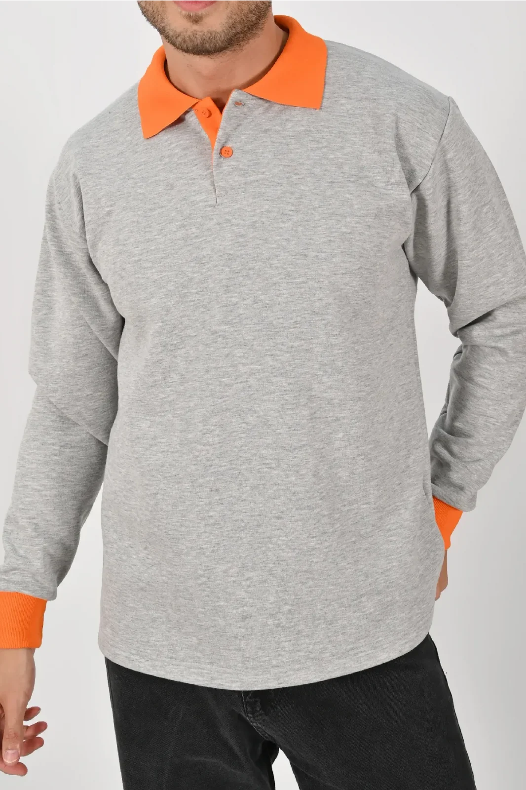 Gri ve turuncunun kontrastıyla tasarlanan Kışlık Gri Çift Renkli Polo Yaka Sweatshirt Turuncu Yakalı, canlı bir görünüm kazandırır. XS–5XL beden aralığı ile farklı vücut tiplerine uygundur.