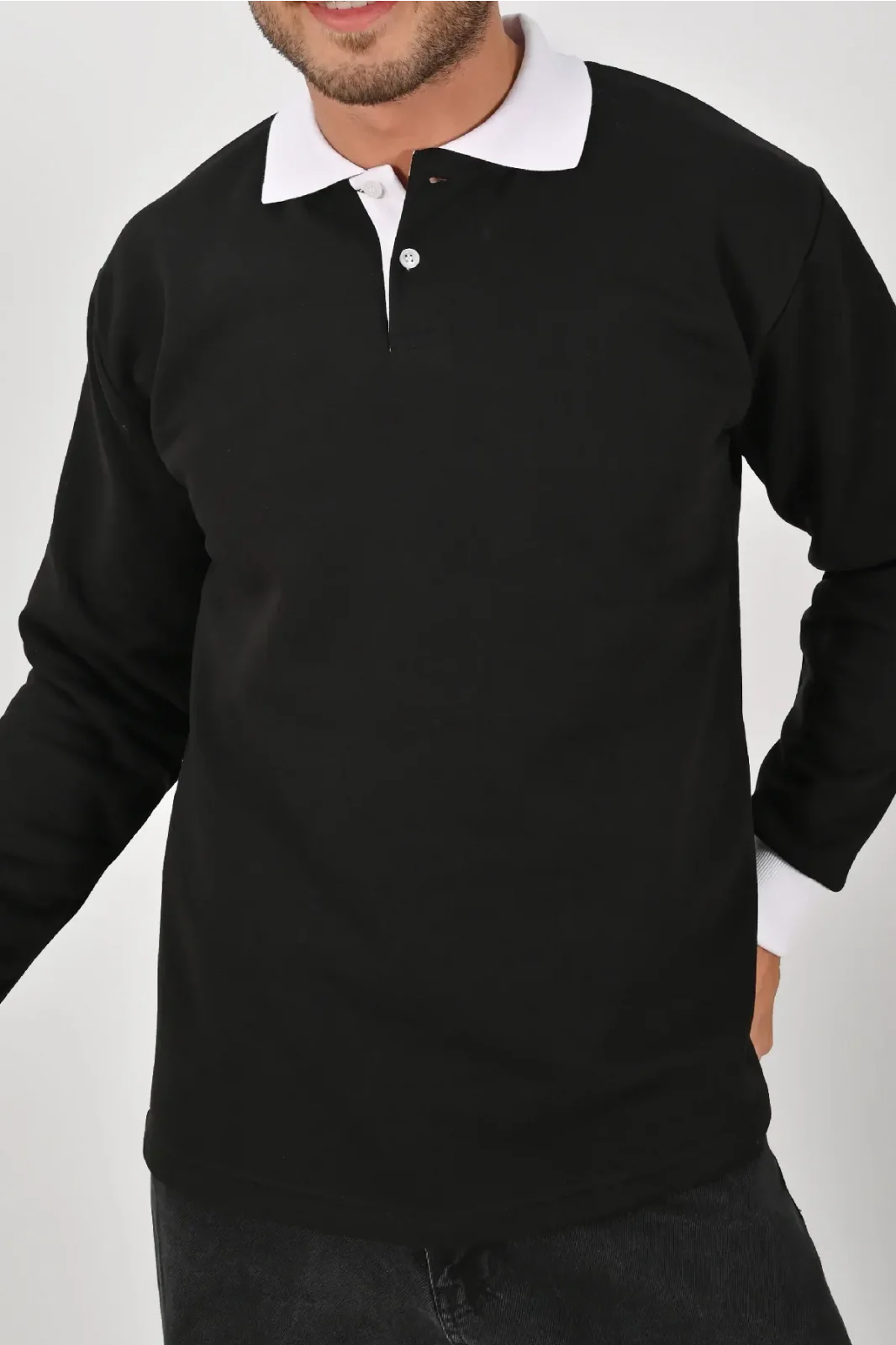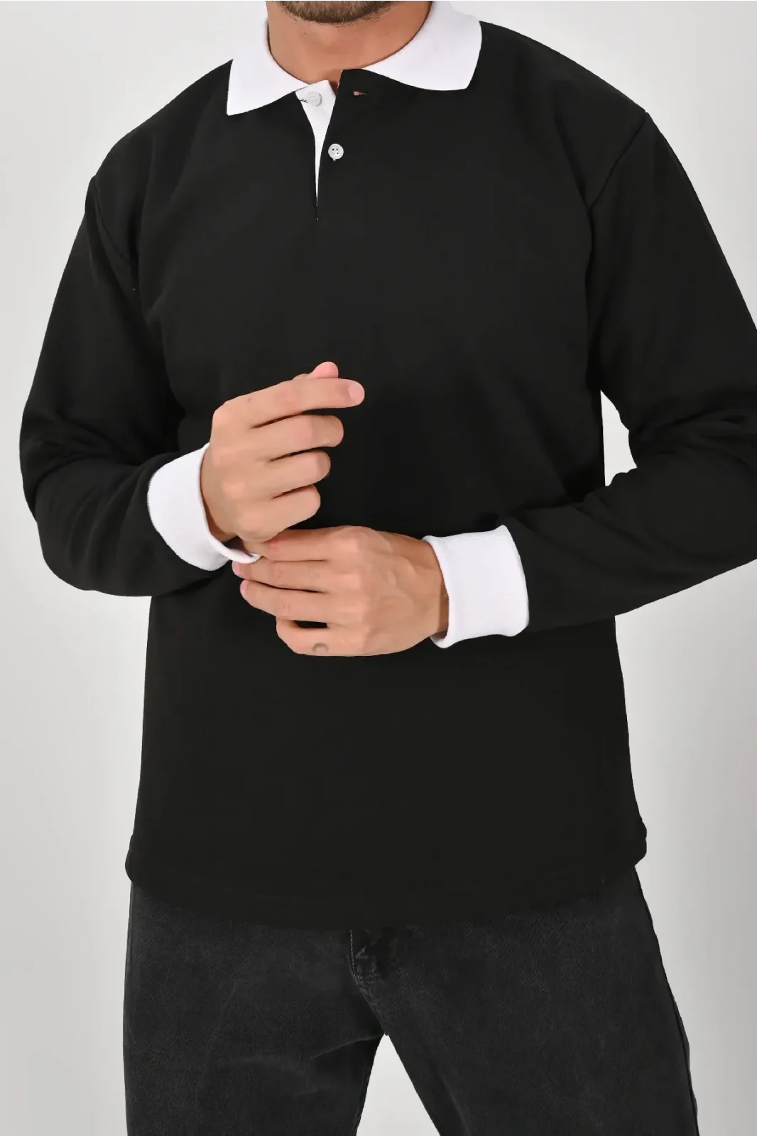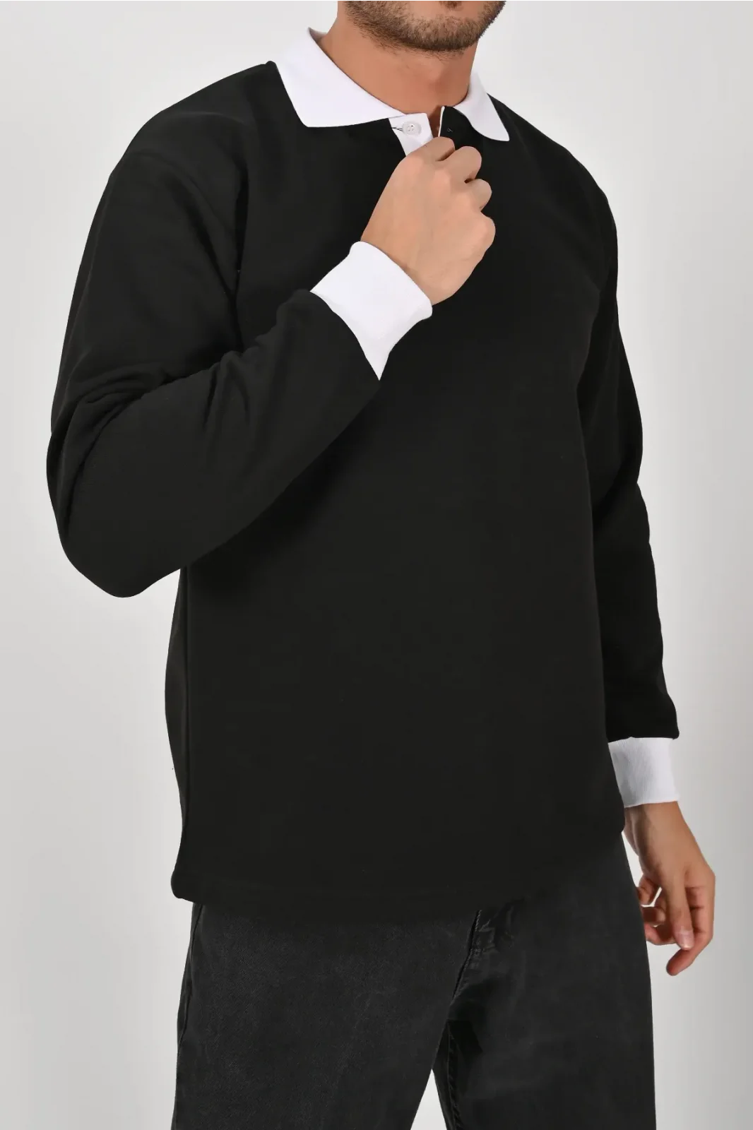 Siyah ve beyazın klasik kontrastıyla öne çıkan Kışlık Siyah Çift Renkli Polo Yaka Sweatshirt Beyaz Yakalı, zamansız bir stil sunar. XS–5XL beden aralığı farklı vücut tiplerine uygundur.