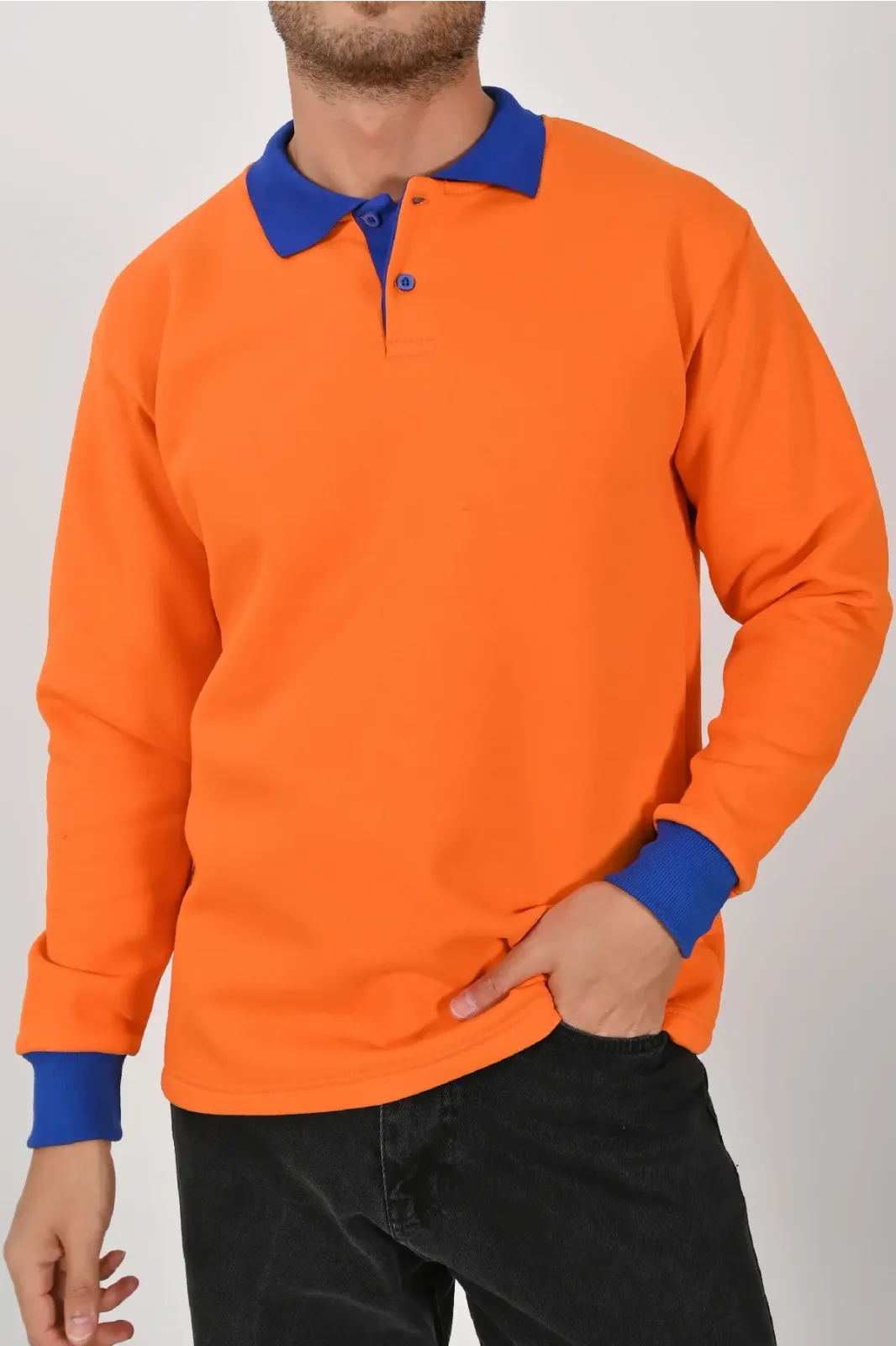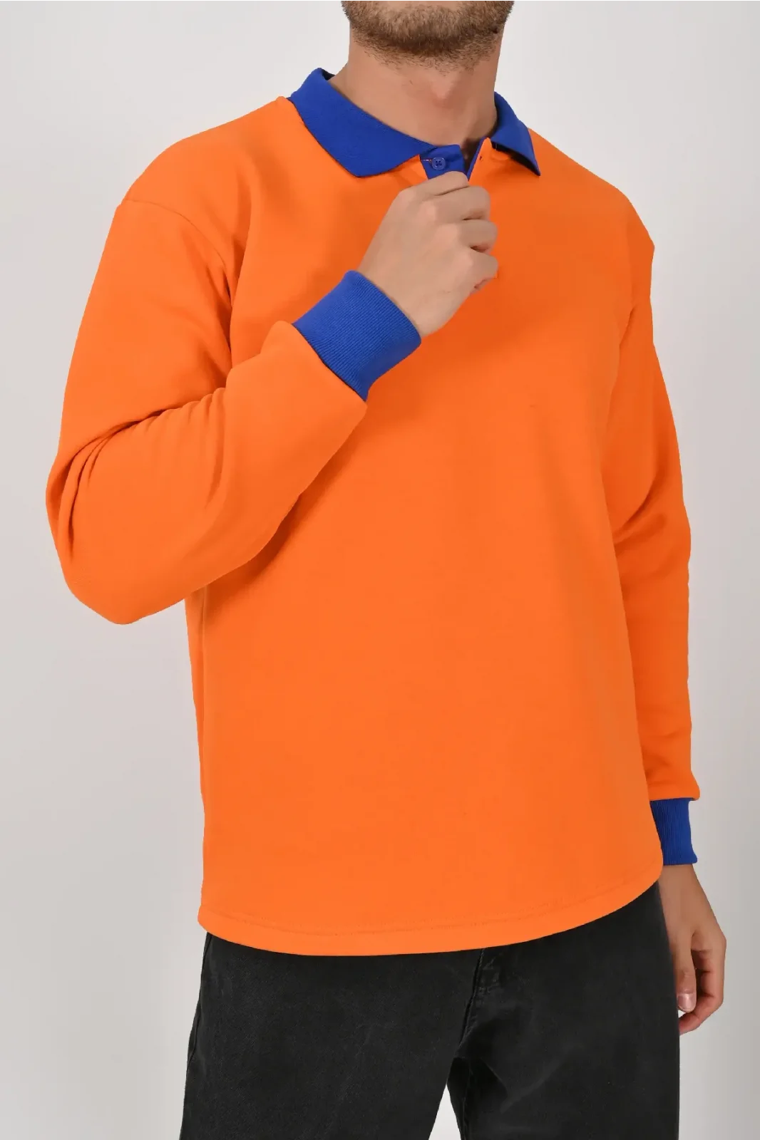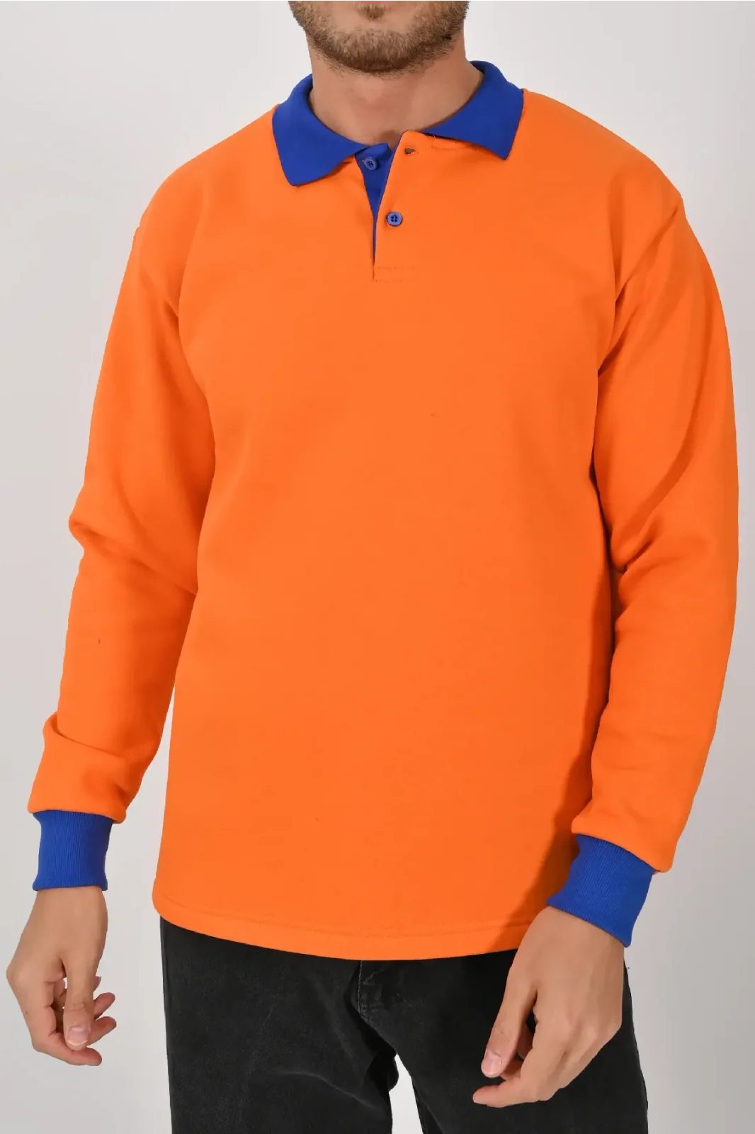 Turuncu ve sax mavisinin enerjik kontrastıyla tasarlanan Kışlık Turuncu Çift Renkli Polo Yaka Sweatshirt Sax Yakalı, dikkat çekici bir stil sunar. XS–5XL beden seçenekleri farklı kullanıcı tiplerine uygundur.