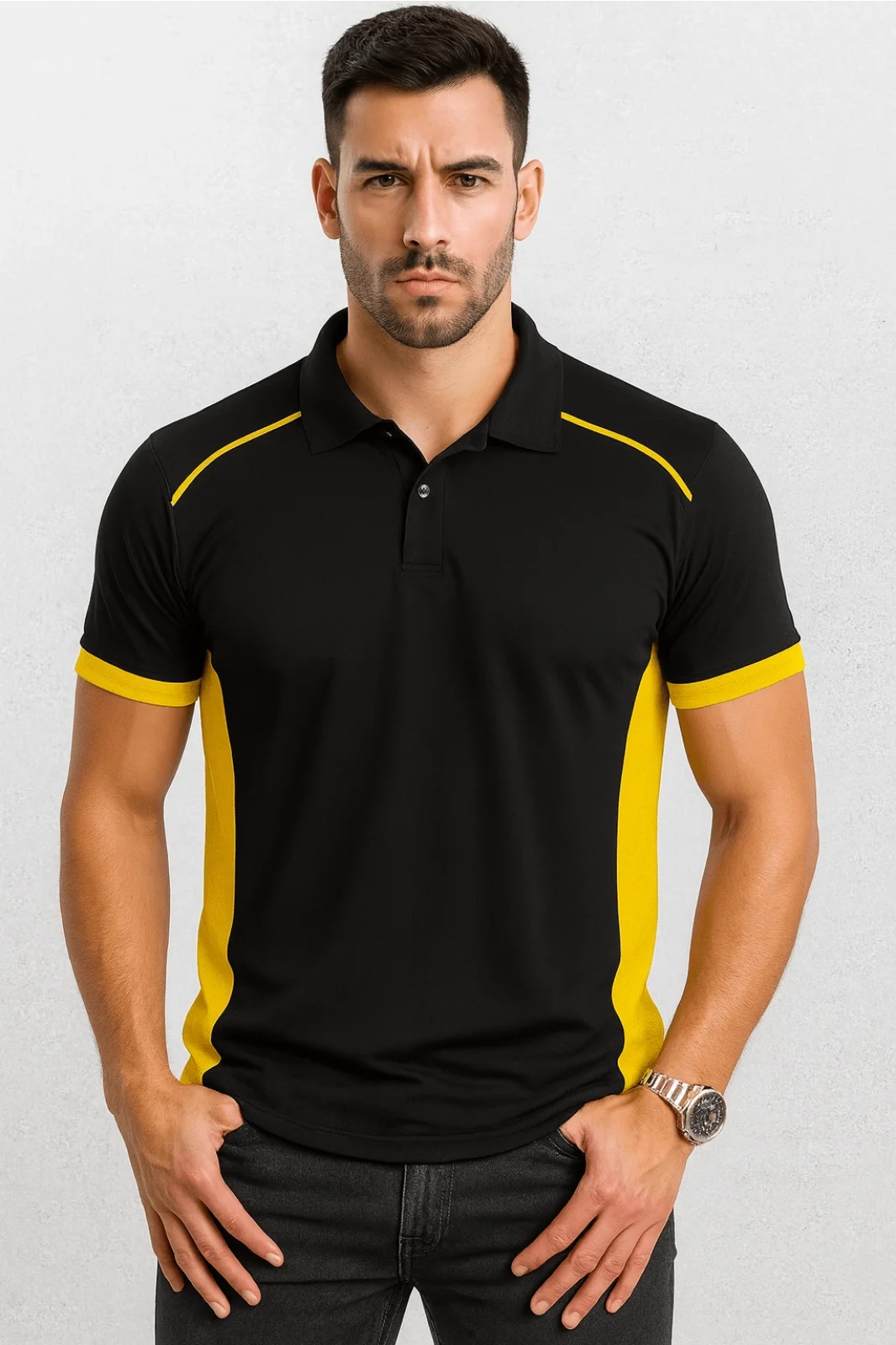 Gri Polo Yaka Tişört Sarı Yakalı Çift Renkli