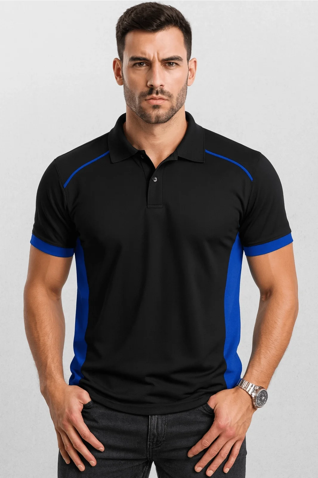 Siyah Polo Yaka Tişört SAX Yakalı Çift Renkli