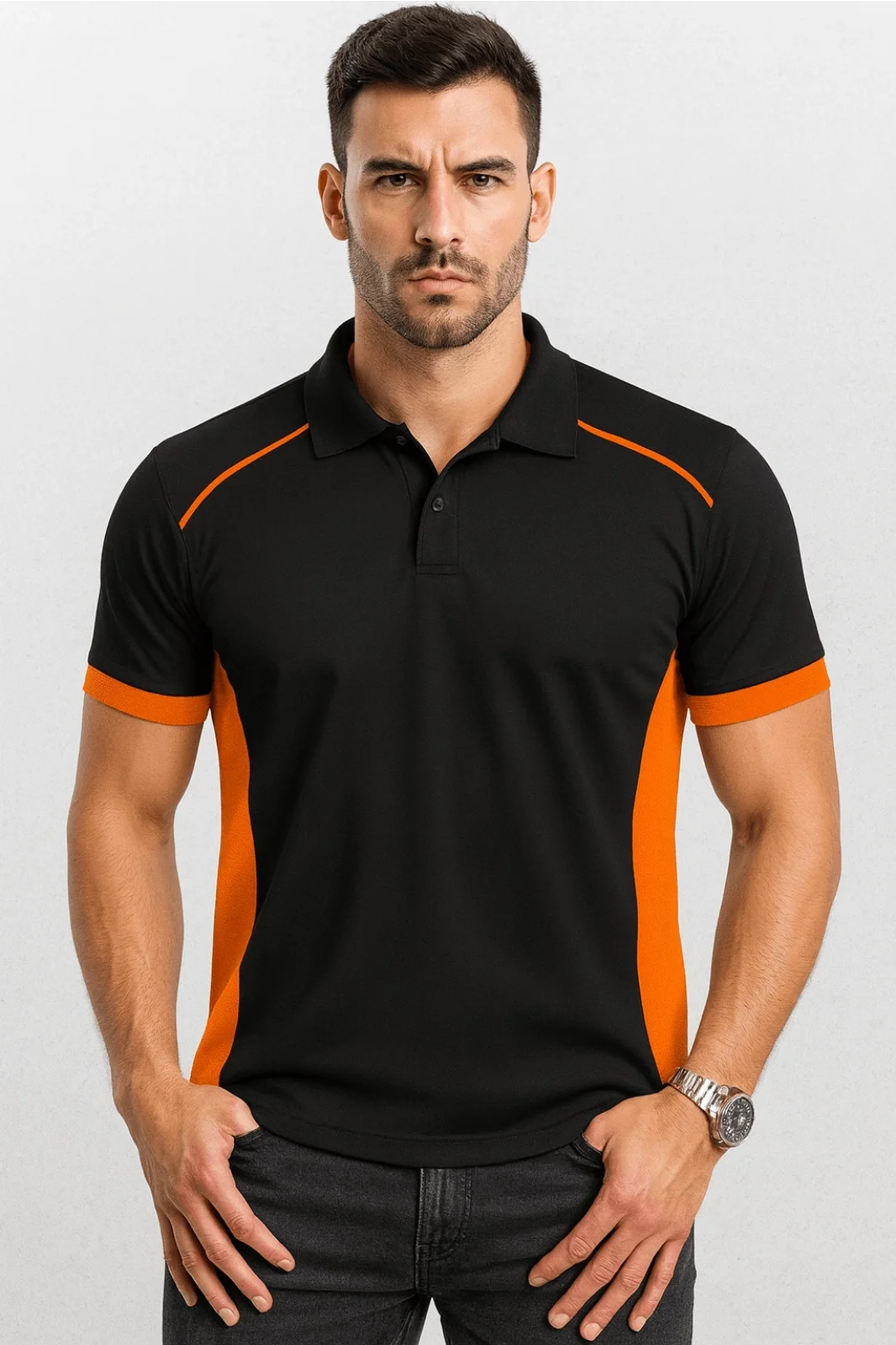 Siyah Lacoste Polo Yaka Tişört Turuncu Yakalı Parçalı Model
